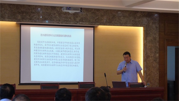 公司副總江一波、事業(yè)部經(jīng)理盧建通分別對(duì)“五新產(chǎn)品”——高聚物改性瀝青防水卷材、金屬屋面用丁基自粘防水卷材(金屬箔、光伏膜)、熱塑性聚烯烴(TPO)防水卷材、三元乙丙(EPDM) 防水卷材、聚氯乙烯(PVC)耐根穿刺高分子防水卷材進(jìn)行了詳細(xì)的產(chǎn)品推介。